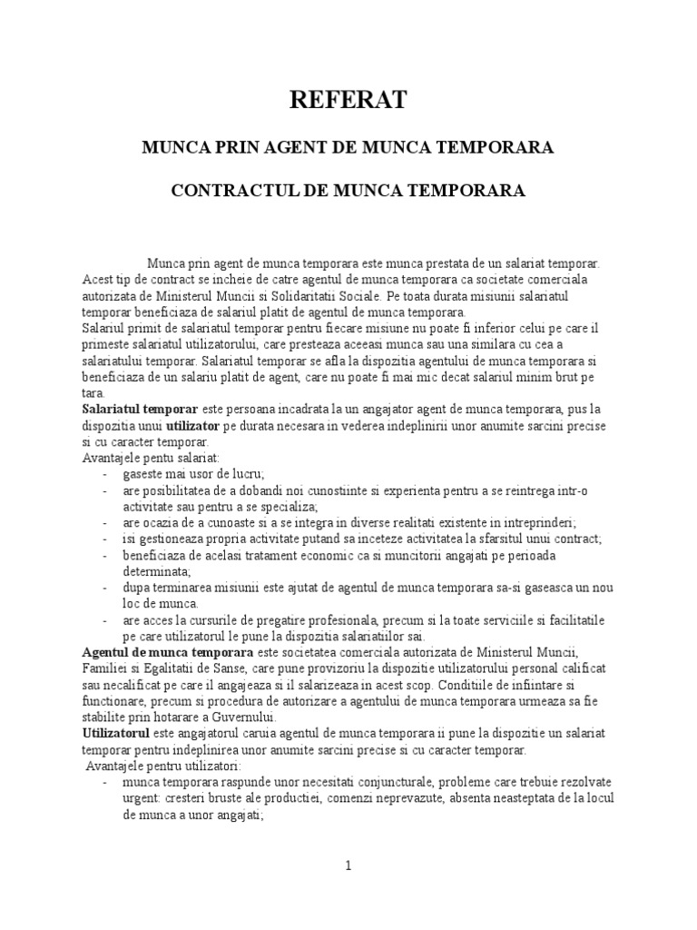 Ckmrajcqa5rkfm Source from : 4 days ago Suntem un agent de munca temporara cu obiect de activitate de contractare, pe baze temporare, a personalului si avem un salariat care este in concediu medical de carantina si. Astfel, contractul de muncă temporară este reglementat prin codul muncii, art. Agentul de munca temporara poate incheia cu salariatul temporar un contract de munca pe durata nedeterminata, situatie in care in perioada dintre doua misiuni salariatul temporar se afla la dispozitia agentului de munca temporara. 94 (1) contractul de muncã temporarã este un contract individual de muncã ce se încheie în scris între agentul de muncã temporarã şi salariatul. Angajatul cu contractul de munca suspendat nu poate avea un alt contract de munca cu aceeasi societate.