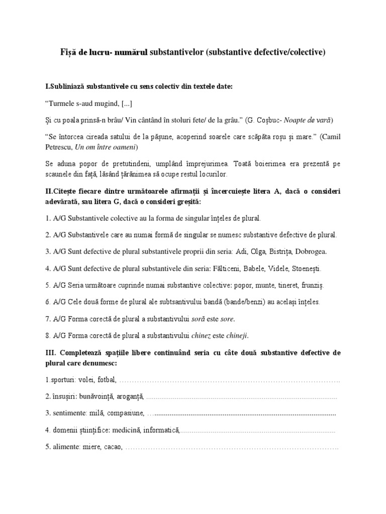 vizitati articolul complet aici : https://www.scribd.com/document/371925789/Defective Forma de plural a unor nume de materie (alămuri, dulceţuri, mătăsuri etc.) defective în mod normal de acest număr, are sensul unui plural colectiv, indicând soiuri, sortimente sau bucăţi din materia respectivă. Categorie gramaticală prin care se exprimă funcțiile sintactice ale substantivului. Fiinţe, lucruri, fenomene ale naturii.