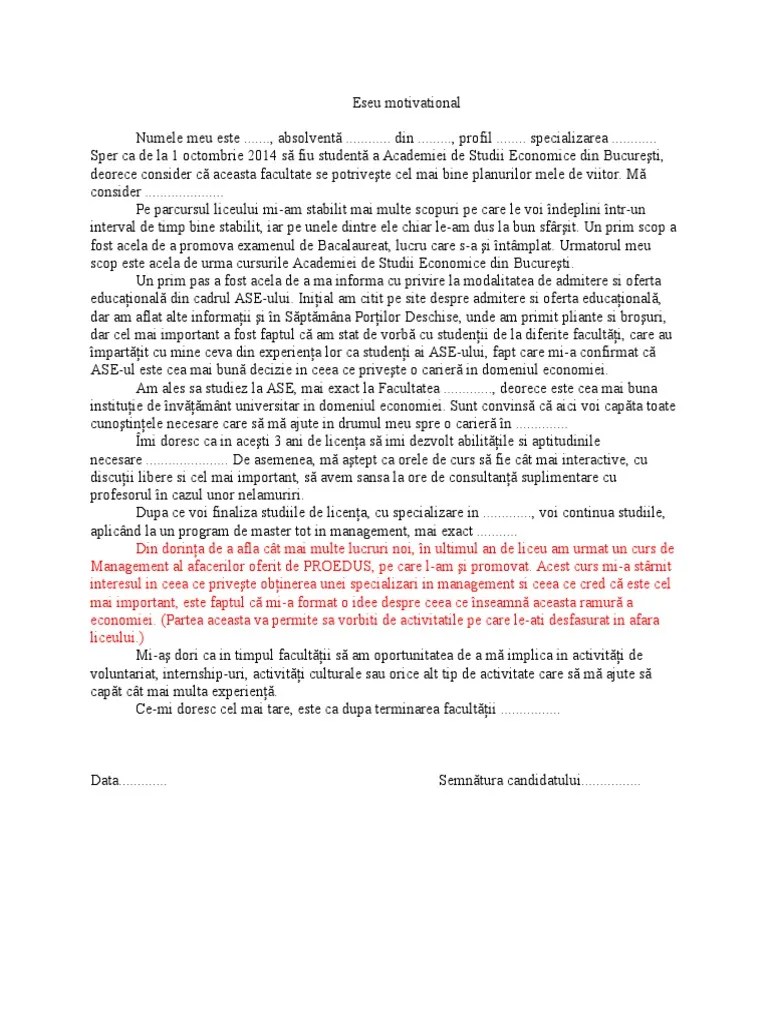 Eseu motivational ase management 2015. Candidatul va elabora un eseu motivațional în care trebuie: Ase admitere 2018 rezultate finale è™i afiè™area listelor cu candidaè›ii . Eseul motivaţional va fi redactat la un rând, cu caractere times new roman 12 și va conţine între 300 şi 500 de cuvinte. Acesta este doar un sablon.